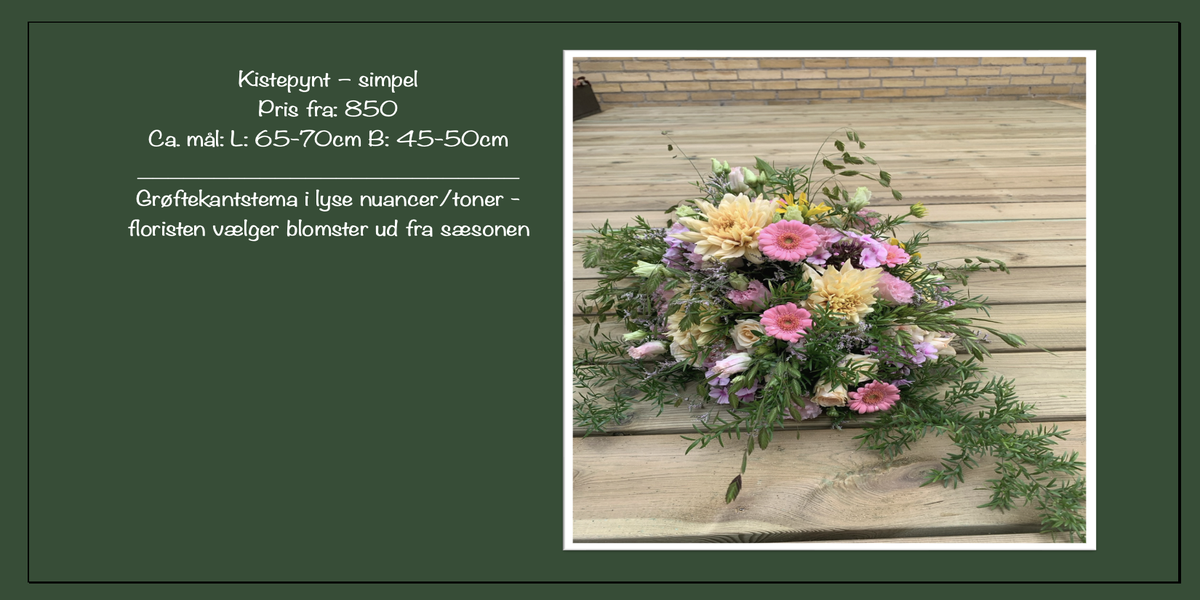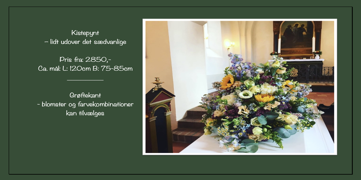 Jeg har den store fornøjelse at samarbejde med Sussi Kirk Blomster. Vores samarbejde er værdifuldt – det er en garanti for kvalitet. Ejer Sussi Kirk har mange års erfaring med dekorationer til afskedsbranchen og hun tryller med blomster som få. Ingen slinger i valsen – kun punktlighed, ordentlighed og en håndværksmæssig præcision, der sikrer de smukkeste dekorationer hver gang.